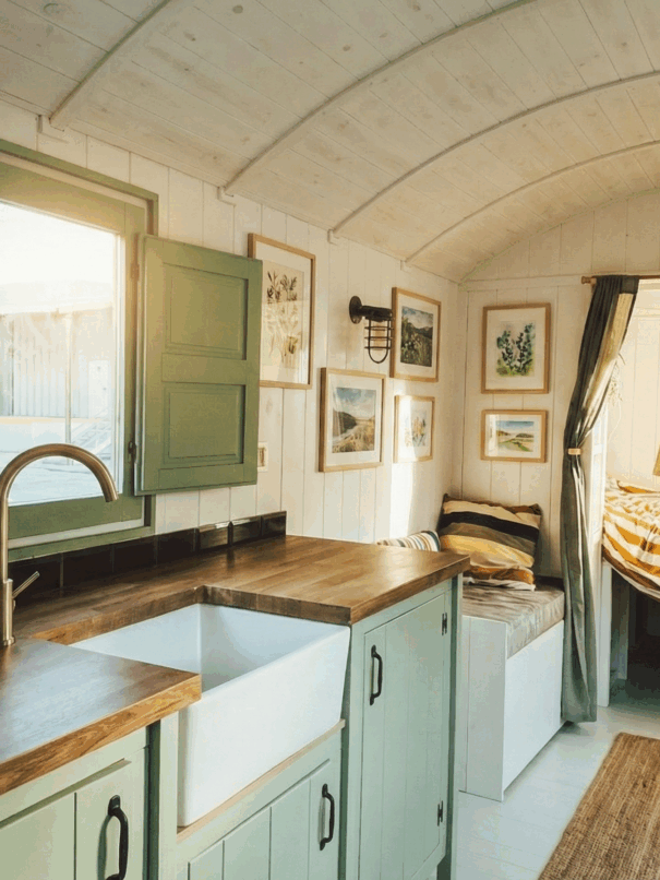 A Casinha is our fully fitted shepherd’s hut, crafted to feel cosy, welcoming, and ready to enjoy from day one. Inside our skilled carpenters have created a natural, light space with thoughtful attention to the details that matter. The hut is fully insulated with wood fibre insulation, lined with a breathable waterproof membrane for year-round comfort, and protected outside with Osmo oil to withstand winter rain and summer sun.